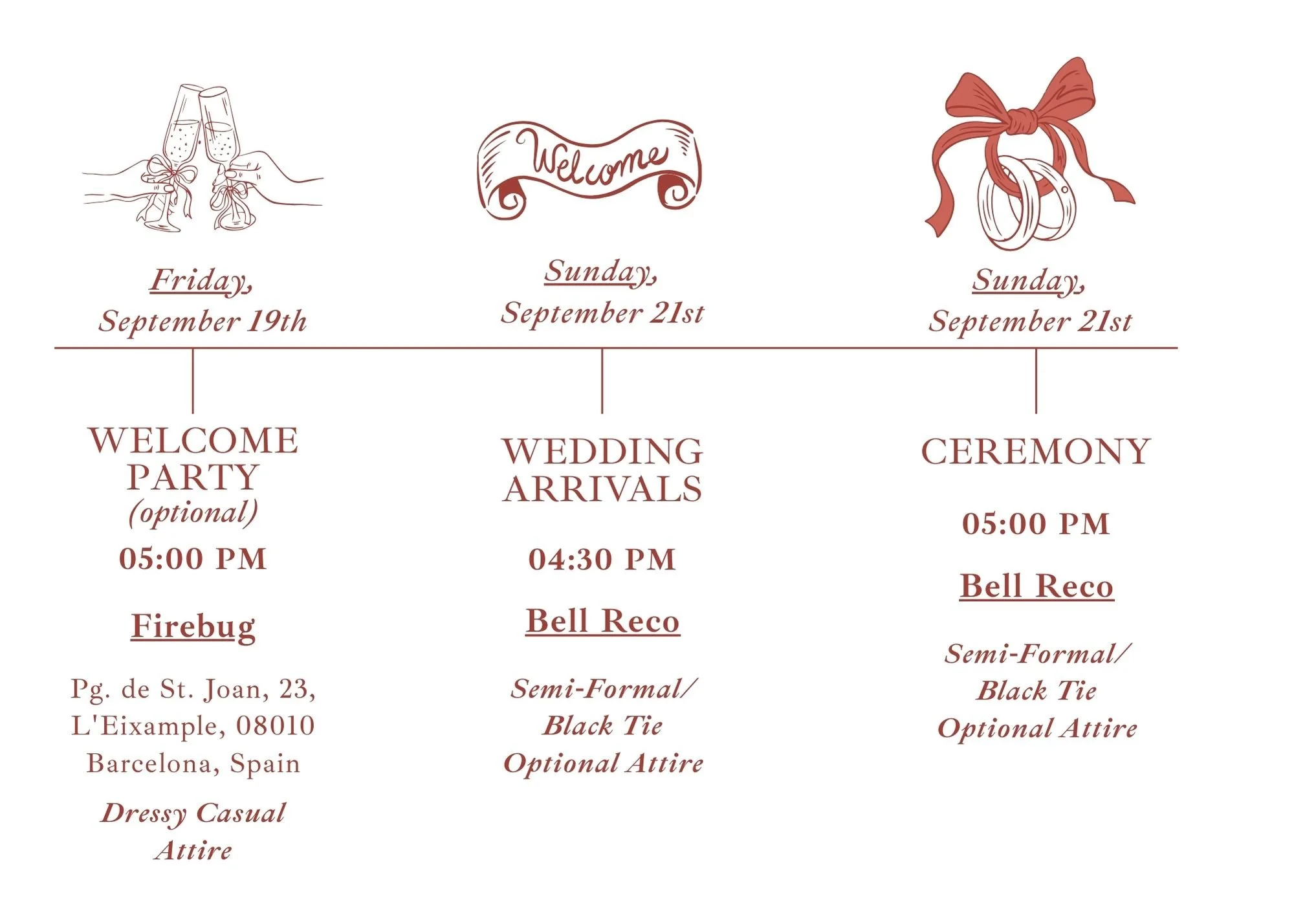 We are so excited to celebrate with our guests! Please take a look at the time line that includes Dress Codes for each events we are hosting!